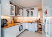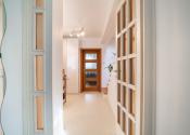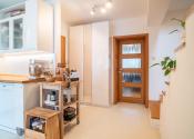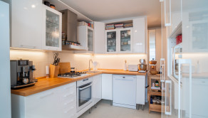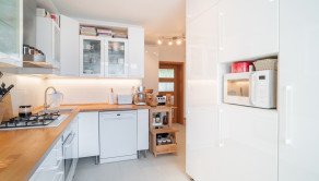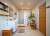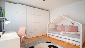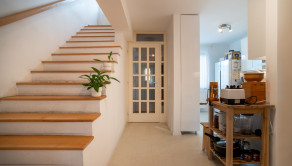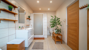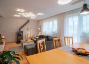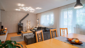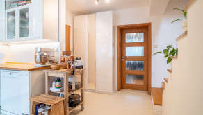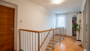 Na prízemí domu sa nachádza priestranná vstupná hala, samostatná kuchyňa, oddelená toaleta, a rozľahlá obývacia izba s rozlohou 29 m², ktorá poskytuje priamy vstup na drevenú terasu a do záhrady. Prízemie dopĺňa vnútorná garáž a technická miestnosť s dodatočným vstupom do záhrady. Na poschodí sú situované tri samostatné spálne, z ktorých dve sú orientované do záhrady a zdieľajú spojený balkón. Tretia spálňa je orientovaná smerom na cestu a má prístup na vlastnú loggiu. V spálniach sa nachádza klíma. Na tomto podlaží sa tiež nachádza kúpeľňa spojená s toaletou.