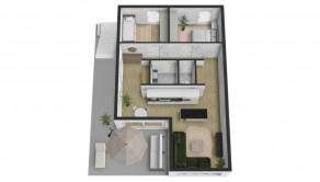Byt disponuje vstupnou chodbou s integrovanými nikami vhodnými na technické zázemie a úložný priestor, samostatným WC, kúpeľňou, dvoma nepriechodnými spálňami (jedna prístupná z chodby, druhá z kuchynskej časti) a veľkorysou dennou zónou v tvare L, ktorá prepája kuchyňu, jedáleň a obývačku. Denná zóna aj spálne majú priamy vstup na balkón a loggiu, z ktorej vedie exteriérové točité schodisko na strešnú terasu s panoramatickým výhľadom na golf a zeleň. Orientácia bytu zabezpečuje maximálne presvetlenie a kontakt s krajinným prostredím.