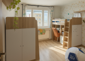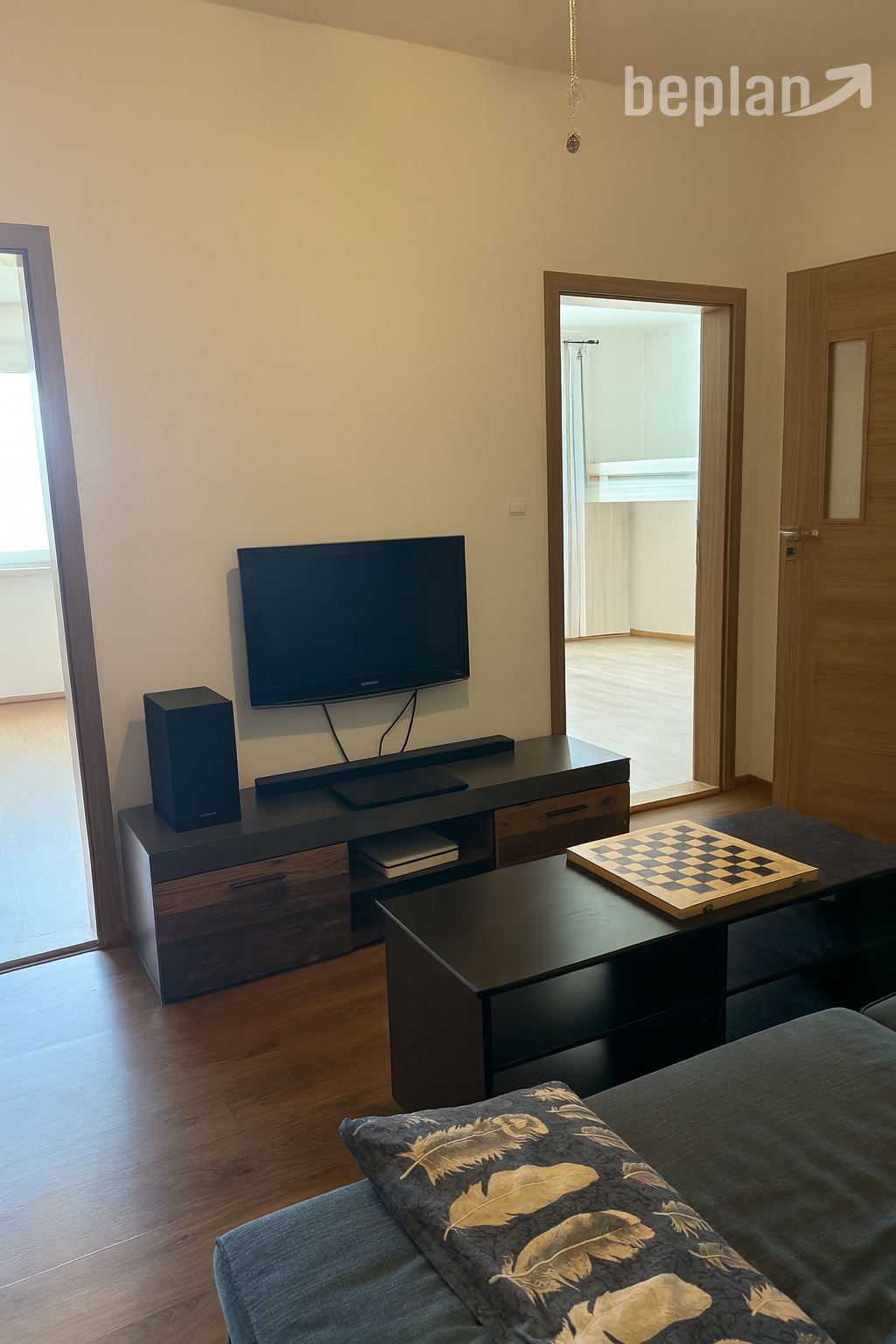 Dispozičné riešenie bytu je veľmi príjemné a praktické. Kuchyňa je samostatne oddelená, čo prináša viac pokoja pri odpočinku v ostatných miestnostiach. Kúpeľňa a toaleta sú tiež oddelené, čo výrazne zvyšuje komfort a súkromie každodenného bývania. Obývacia izba sa nachádza v centrálnej časti bytu, čím prirodzene vytvára spoločenský priestor pre celú domácnosť. Byt ďalej ponúka dve priestranné izby a jednu spálňu, ktoré poskytujú dostatok miesta pre bývanie aj prácu z domu. Balkón je plne integrovaný do kuchyne a v obývacej izbe sa nachádza stropný ventilátor.
