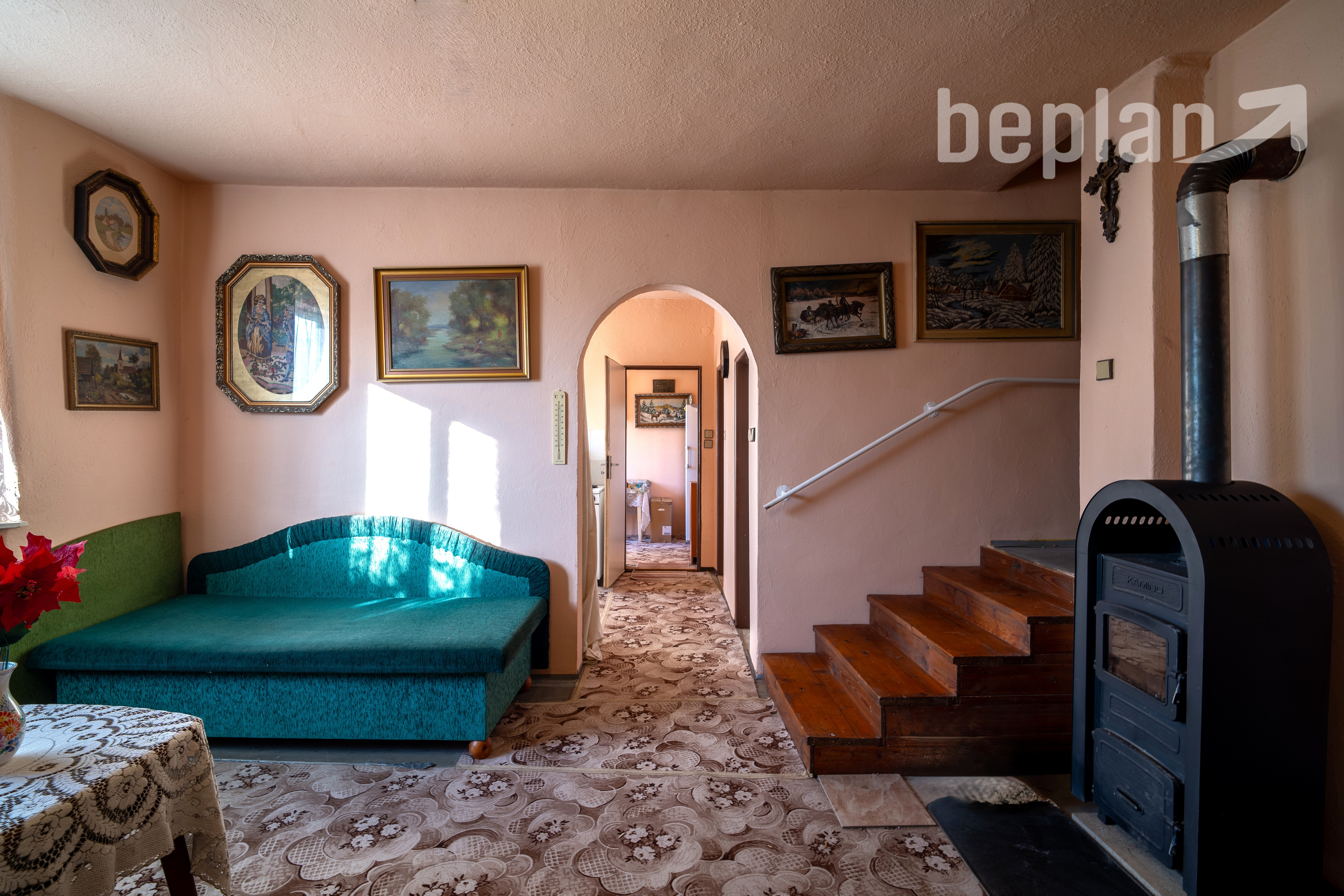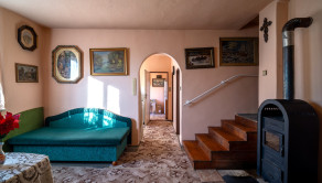 Pri vstupe do nehnuteľnosti sa nachádza chodba, z ktorej sa priamo dostanete do samostatnej špajze. Na pravej strane chodby sa nachádza ďalšia chodba, ktorá rozdeľuje dispozíciu – napravo vedie do kuchyne a naľavo do kúpeľne s WC. O niekoľko krokov ďalej sa nachádza samostatná komora, cez ktorú je vstup do pivnice. Z chodby pokračujete do priestrannej obývacej miestnosti, ktorá je najväčšou miestnosťou v celom dome. Z obývačky vedie menšie schodisko do nepriechodnej miestnosti, vhodnej ako spálňa alebo ďalšia izba.