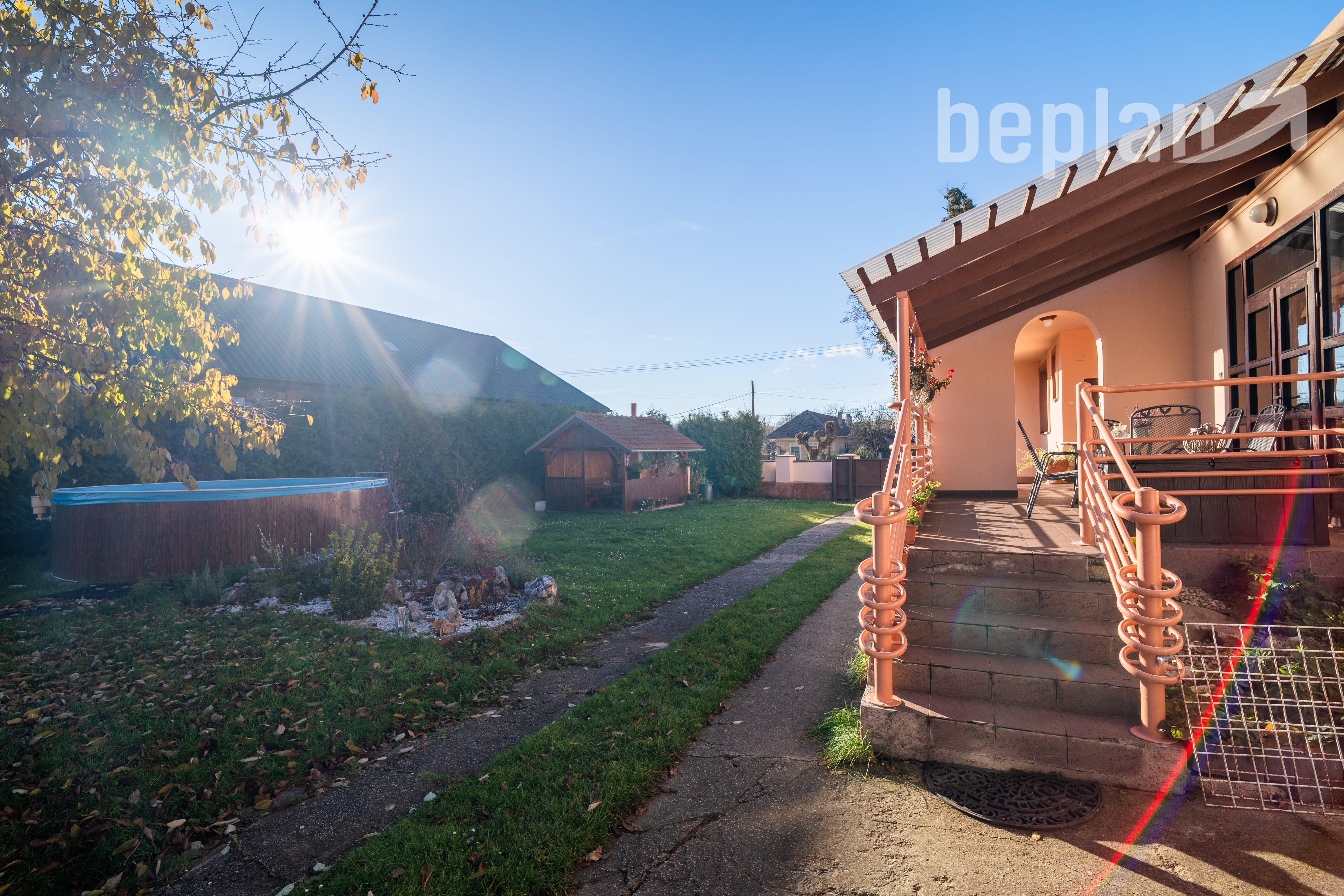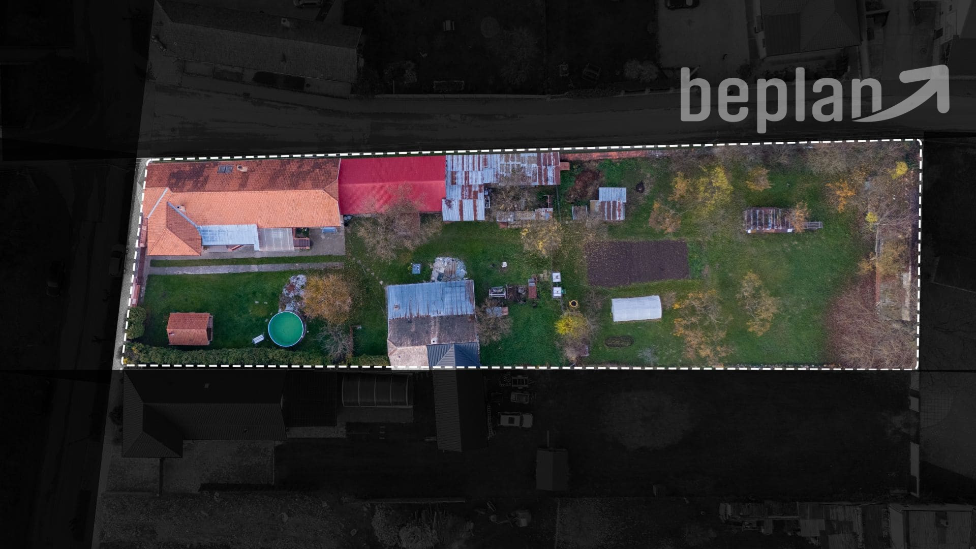 Pozemok je rovinatý a v súčasnosti funguje ako jeden celok, pričom ponúka možnosť rozdelenia aj vytvorenia samostatného vstupu. Na pozemku sa nachádza altánok na pevnom základe, ktorý je zapísaný v liste vlastníctva. V blízkosti nájdete aj bazén, garáž, technické miestnosti a skladové priestory. Zadná časť pozemku je využívaná na pestovanie zeleniny a na jeho konci sa nachádza ďalšia miestnosť vhodná ako dodatočný sklad.