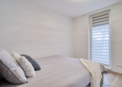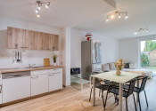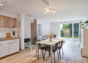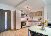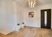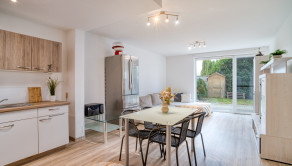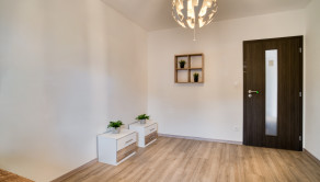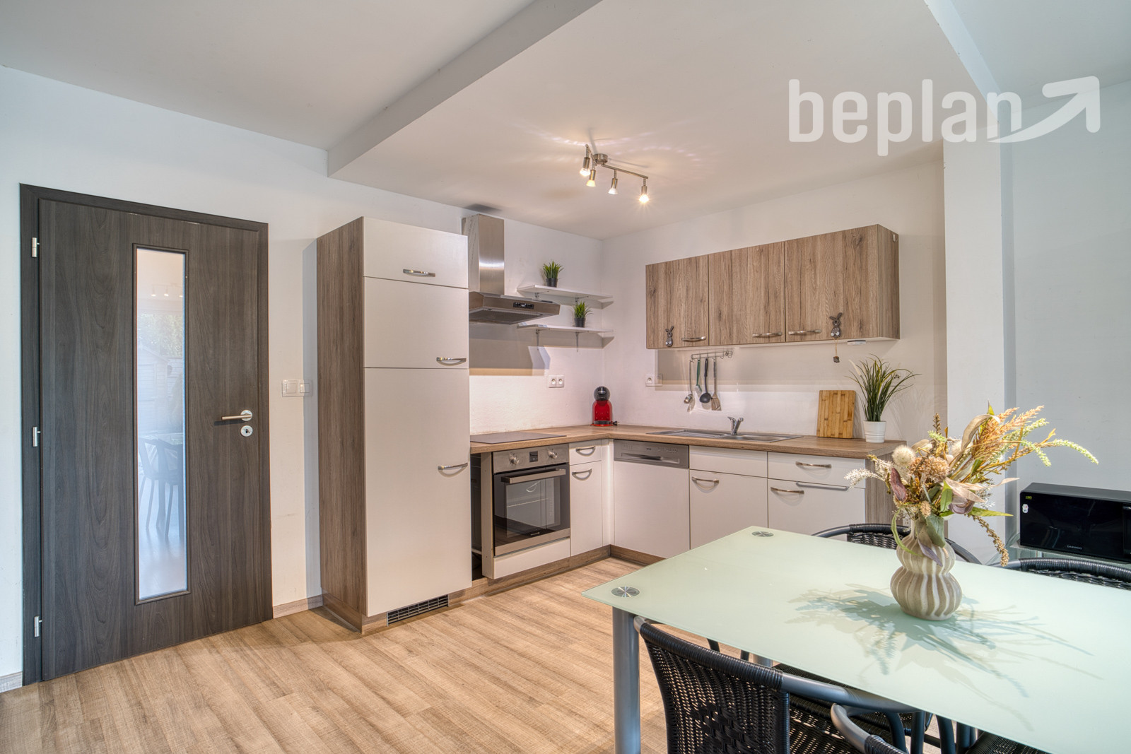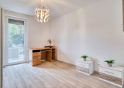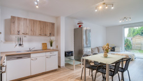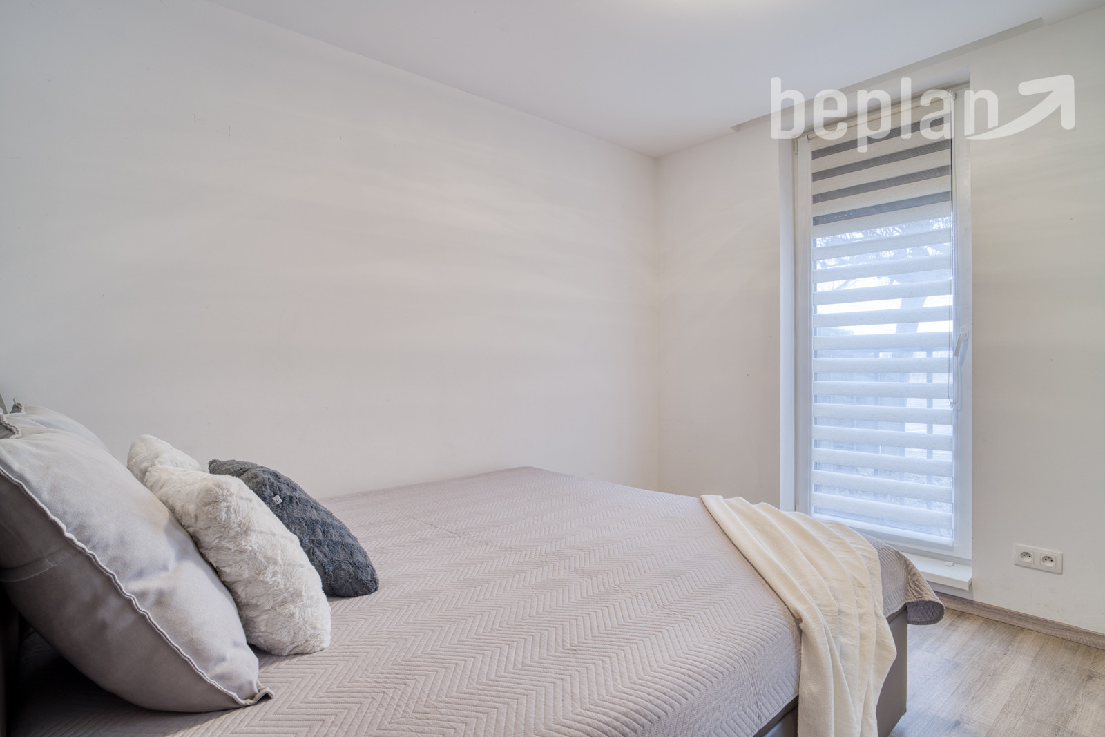 Nehnuteľnosť pozostáva zo vstupnej haly, odkladacej miestnosti, samostatného WC, obývačky prepojenej s kuchyňou (orientácia JZ), dvoch samostatných spální, pričom hlavná je orientovaná na SV, a kúpeľne s vaňou. Z obývacej izby je zároveň priamy výstup na terasu a záhradu a vchod do bytu je orientovaný na SV.