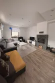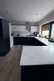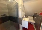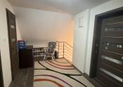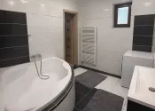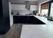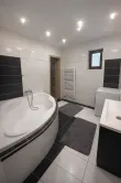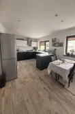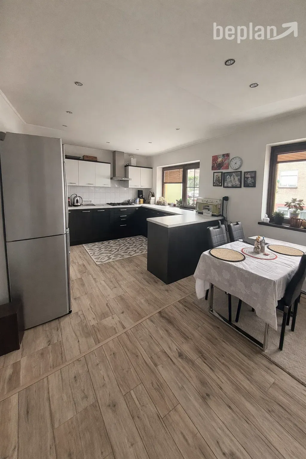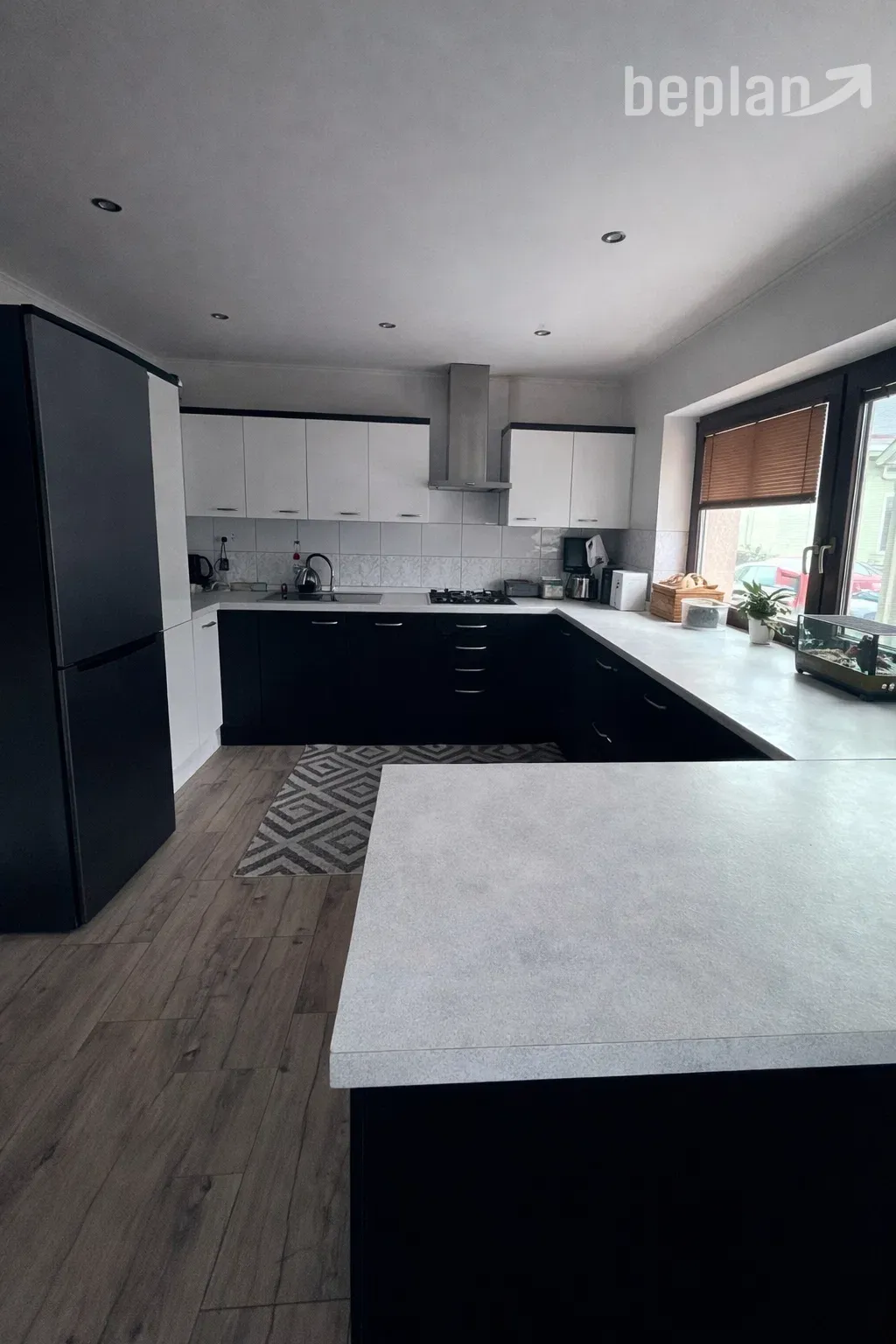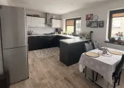 Izba s vlastnou kúpeľňou je vybavená skriňou, komodou a písacím stolom, čím ponúka praktický a komfortný priestor na bývanie aj prácu. Detská izba disponuje šatníkovou skriňou a dostatkom miesta na zariadenie podľa potrieb dieťaťa. Spálňa je zariadená posteľou a dvomi šatníkovými skriňami, ktoré poskytujú dostatok úložného priestoru. Obývacia izba je vybavená pohodlnou sedačkou, obývačkovou zostavou a jedálenským stolom, čím vytvára príjemný priestor na oddych aj spoločné chvíle. Kuchyňa je plne vybavená modernou kuchynskou linkou so spotrebičmi, medzi ktoré patrí chladnička, umývačka riadu, elektrická rúra a varná doska. Na prízemí je zavedené komfortné podlahové kúrenie, pričom vykurovanie celého domu zabezpečuje plynový kotol.