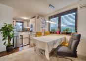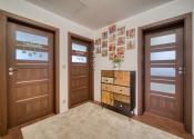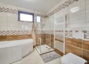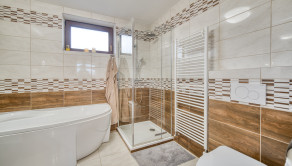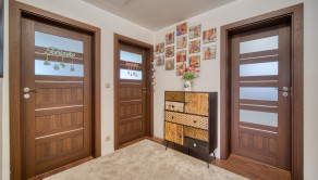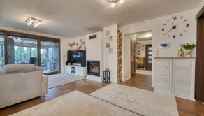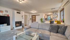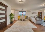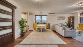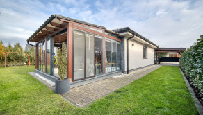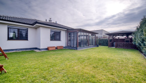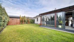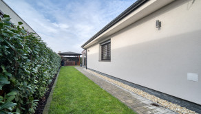 Dom má premyslené a funkčné delenie priestoru, ktoré začína vstupnou časťou s predsieňou, z ktorej je priamy prístup do samostatnej toalety aj do garáže. Na ňu nadväzuje denná časť tvorené otvoreným priestorom obývacej izby s krbom a plne vybavenej kuchyne s prémiovým vyhrievaným šuflíkom na šálky. Medzi dennou a nočnou časťou je strategicky umiestnená samostatná technická miestnosť, ktorá zabezpečuje praktické technické zázemie domu. Nočná časť pozostáva z troch samostatných spální a hlavnej kúpeľne, čím ponúka dostatok súkromia pre celú rodinu. V celom dome sú osadené atypické interiérové dvere a zárubne s nadštandardnou výškou 210 cm, ktoré podčiarkujú jednotný a moderný dizajn interiéru. Nehnuteľnosť zároveň ponúka variabilitu v podobe možnosti jednoduchého rozšírenia na 5-izbový dom prerobením garáže, pričom podlahové kúrenie je už v tejto časti vyvedené. Exteriér dotvára samostatný altánok s murovaným grilom s prívodom vody a elektriny, záhradný domček, drevník a pohodlné parkovanie až pre päť áut.