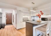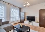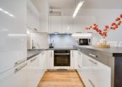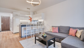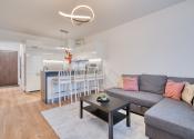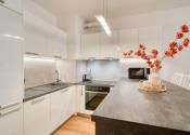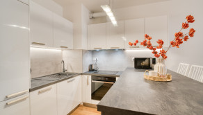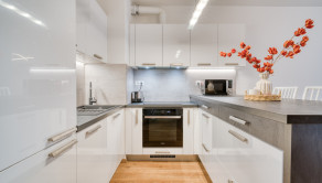 • Denná časť: Otvorená dispozícia obývacej izby spojenej s kuchyňou. Kuchynská linka disponuje spotrebičmi (chladnička s mrazničkou, varná doska, elektrická rúra, digestor, umývačka riadu), doplnená o štýlový barový pult gauč a TV. Zároveň komfort dodáva aj klimatizačná jednotka.