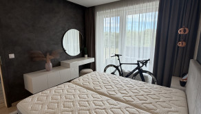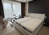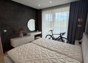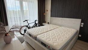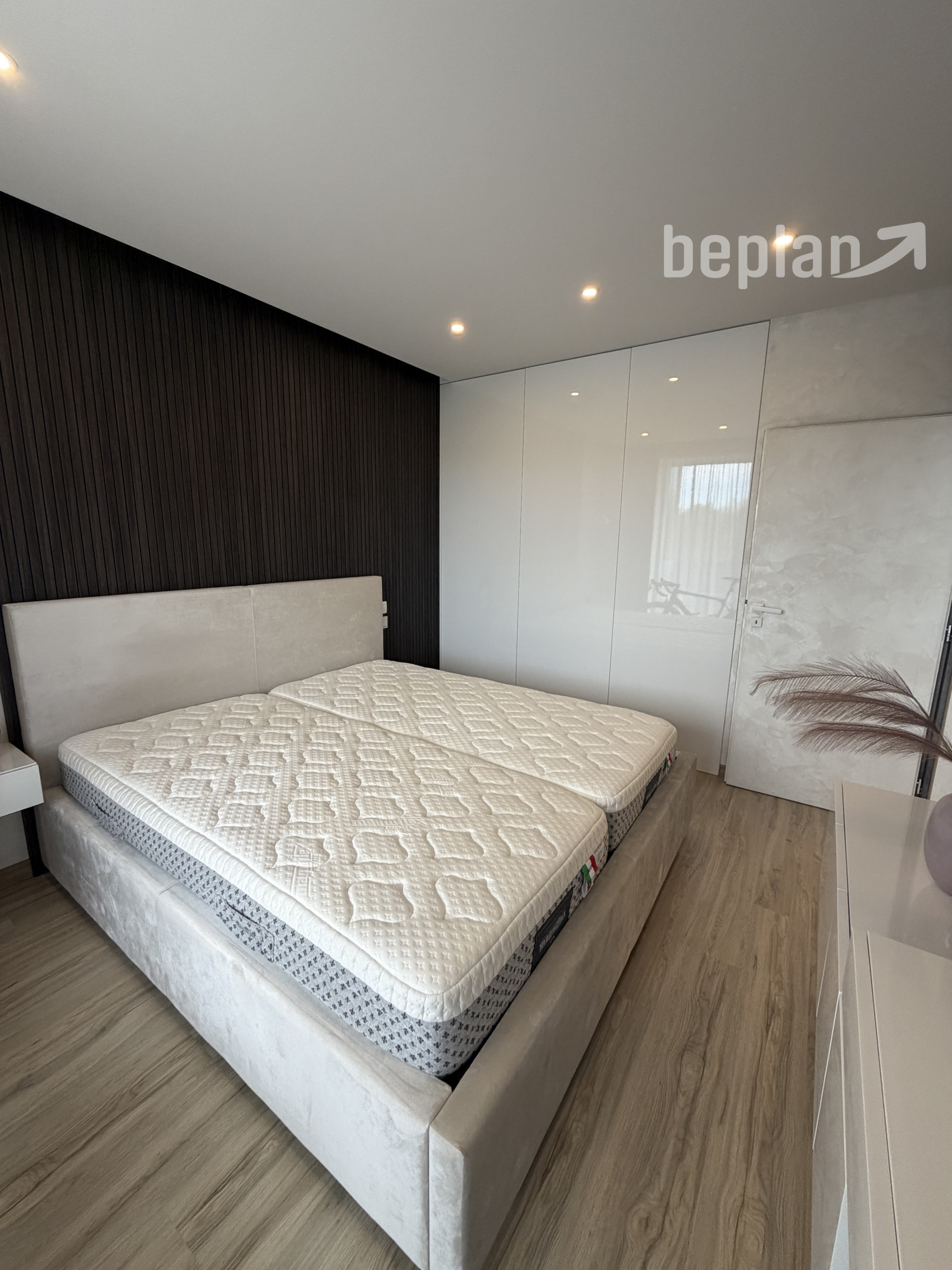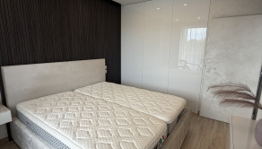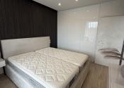 Spálňa disponuje vstavaným šatníkom, nábytkom na mieru a kvalitnou dvojlôžkovou posteľou s matracmi značky Magniflex. Byt je orientovaný na juhovýchod, čo zabezpečuje dostatok denného svetla.