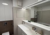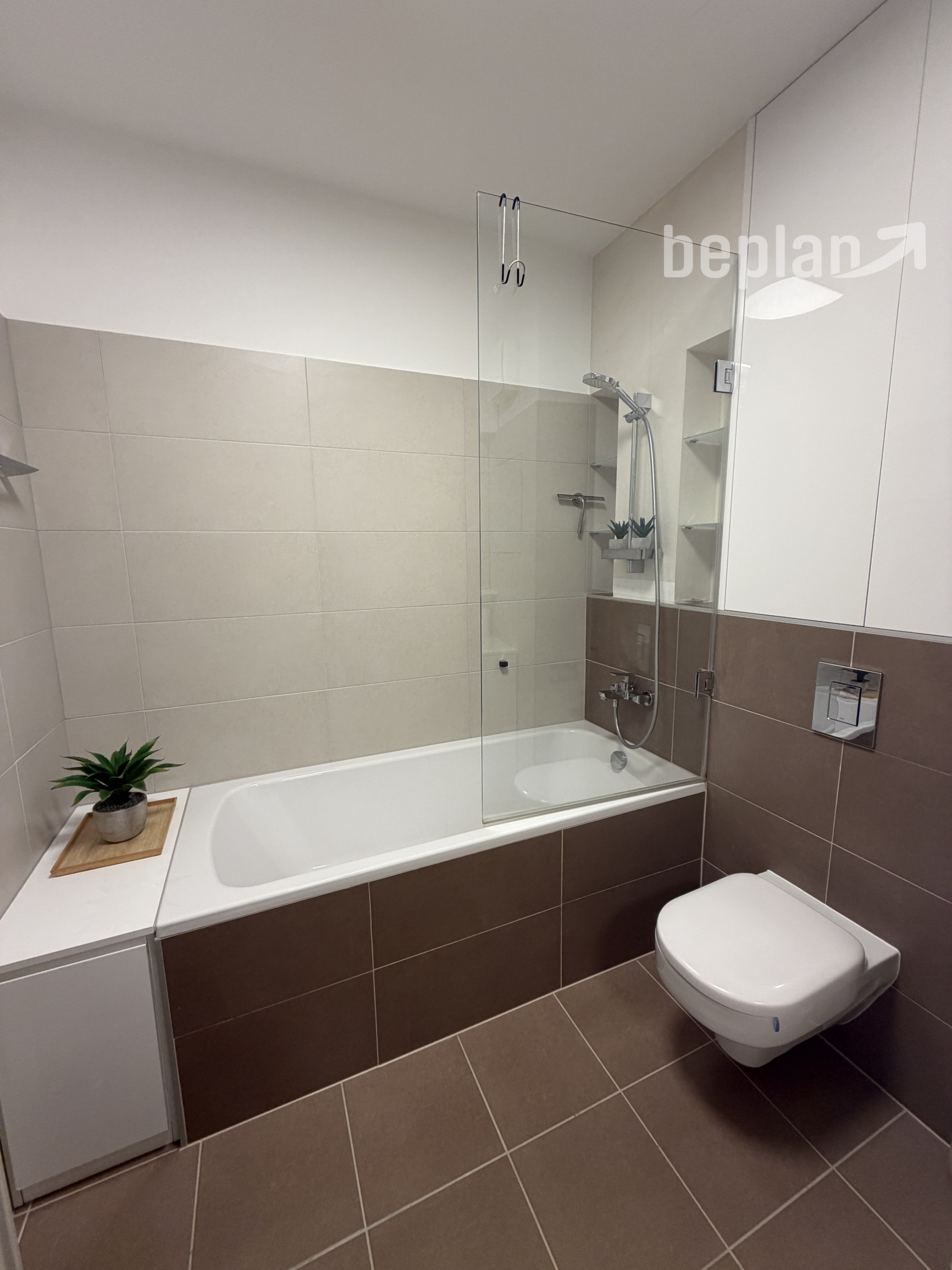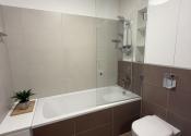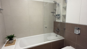 Dispozícia bytu je praktická a premyslene riešená. Po vstupe sa nachádza chodba so vstavanou skriňou, z ktorej je prístup do kúpeľne spojenej s toaletou. Kúpeľňa je vybavená vaňou so sklenenou zástenou a ponúka aj úložný priestor.